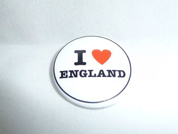 A circular coloured plastic "I Love England" button badge, 2.5 cms diameter, carded
