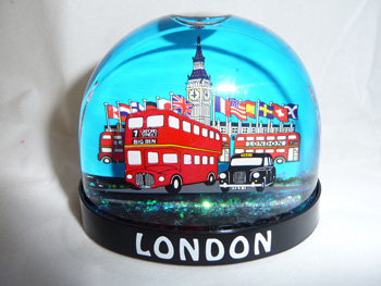 A plastic snowglobe showing double decker bus and taxi, 5.5 cms