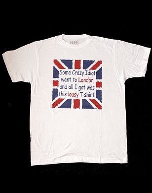 A 100% cotton white t-shirt "SOME CRAZY IDIOT WENT TO LONDON AND ALL I GOT WAS THIS LOUSY T-SHIRT" in a union jack border, packaged, available S/M/L/XL